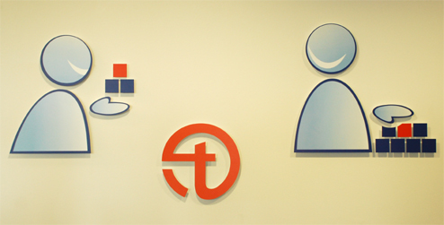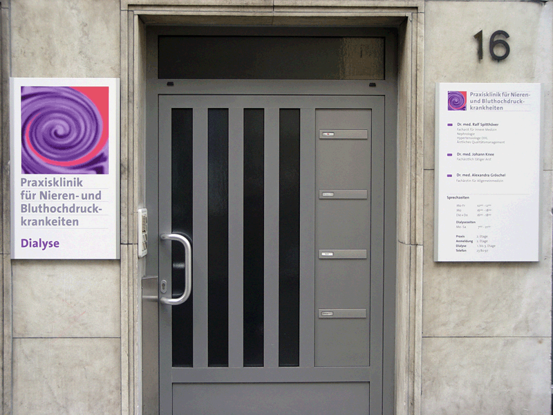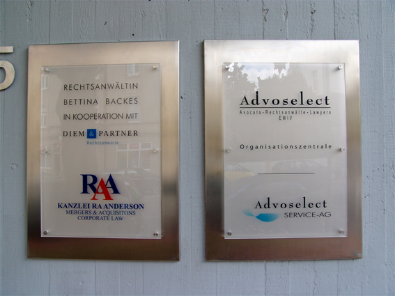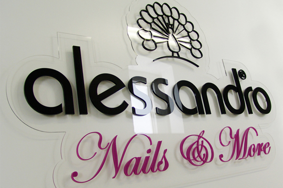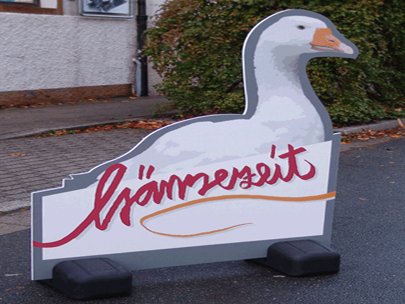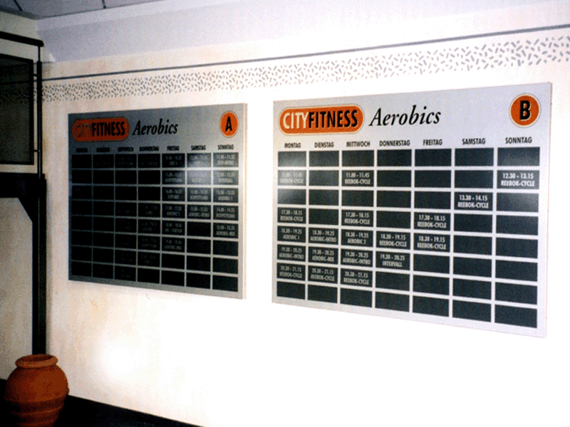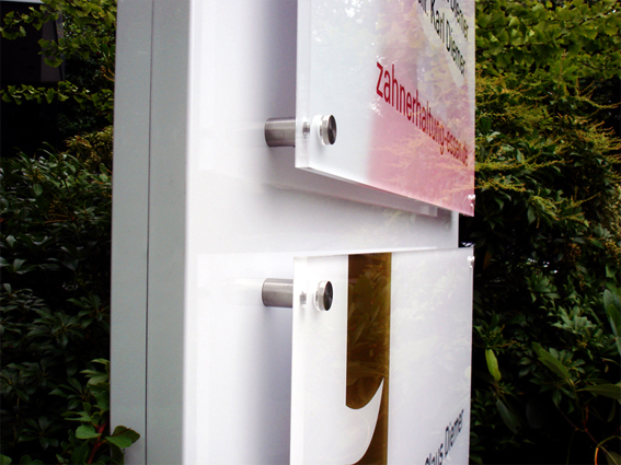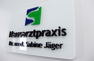 Schilder und 3D-Elemente werden je nach Einsatzgebiet z. B. aus Kunststoff- oder Aluverbund-Material gefertigt. Man kann sie je nach Material von vorne oder hinten beschriften.